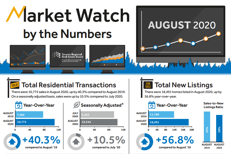 TORONTO, ONTARIO, September 3, 2020 – Toronto Regional Real Estate Board (TRREB) President Lisa Patel announced that the strong rebound in Greater Toronto Area (GTA) home sales continued with a record result for the month of August. GTA REALTORS® reported 10,775 residential sales through TRREB’s MLS® System in August 2020 – up by 40.3 per cent compared to August 2019.
