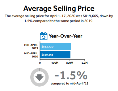 • The average selling price for sales reported during the first 17 days of April 2020 was $819,665 – down by 1.5 per cent compared to the same period in 2019.