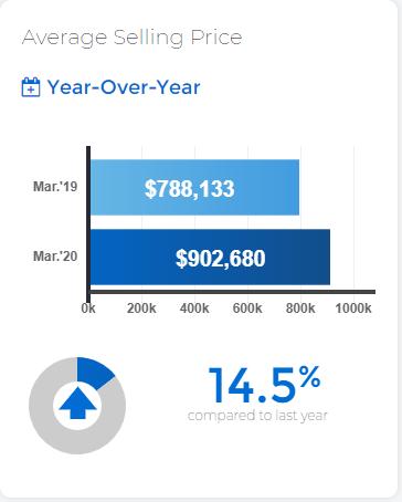 The MLS® Home Price Index Composite Benchmark price was up by 11.1 per cent year-over-year in March 2020. The average selling price for March 2020 as a whole was $902,680 – up 14.5 per cent compared to March 2019. The average selling price for sales reported between March 15 and March 31, was $862,563 – down from the first half of March 2020, but still up by 10.5 per cent compared to the same period last year.