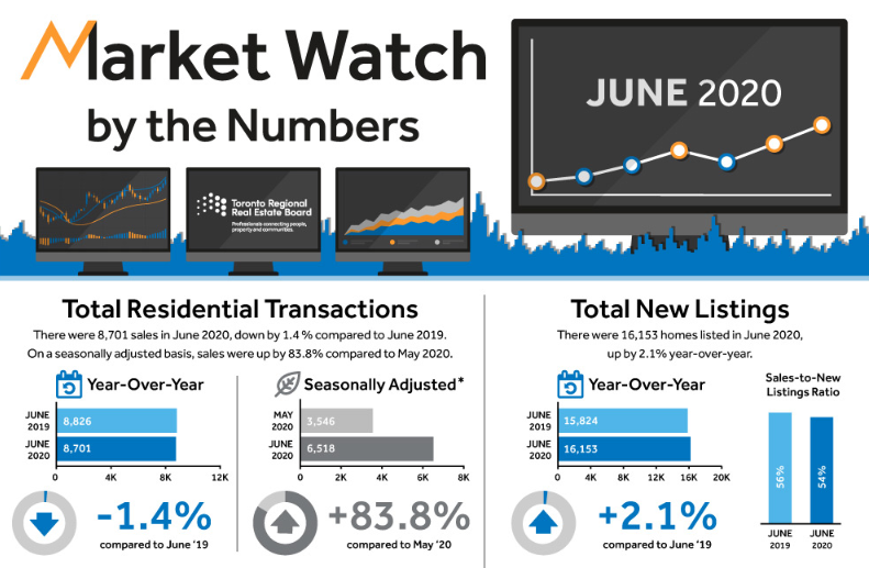 TORONTO, ONTARIO, July 7, 2020 – Toronto Regional Real Estate Board President Lisa Patel announced that Greater Toronto Area REALTORS® reported 8,701 sales through TRREB’s MLS® System in June 2020. This result represented a very substantial increase over the May 2020 sales result, both on an actual (+89 per cent) and seasonally adjusted basis (+84 per cent), and was only down by 1.4 per cent compared to June 2019.