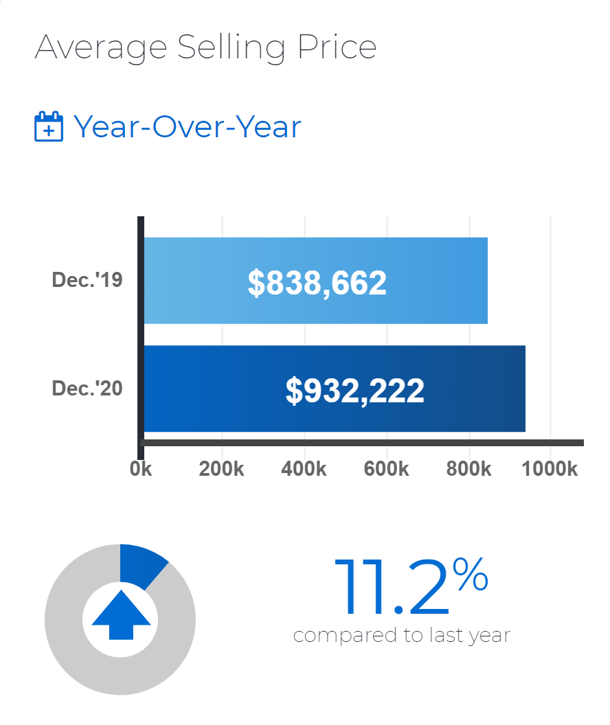 • The average selling price reached a new record of $929,699 – up by 13.5 per cent compared to 2019. This included an average price of $932,222 in December – a year-over-year increase of 11.2 per cent. The strongest average price growth was experienced for single-family home types in the suburban regions of the GTA.