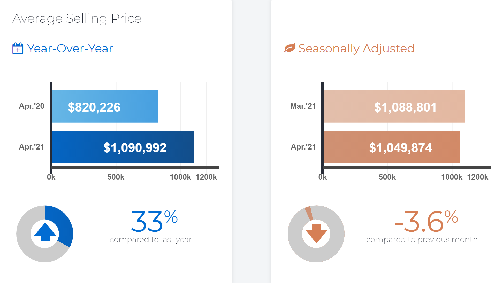 The MLS® Home Price Index Composite benchmark was up by 17.8 per cent year-over-year. The Composite benchmark also increased on a monthly basis, but the pace of monthly growth decelerated. The average selling price of $1,090,992 was up by 33 per cent compared to April 2020, but was basically flat relative to March 2021. This was in contrast to most years in the past when the average selling price increased between March and April.