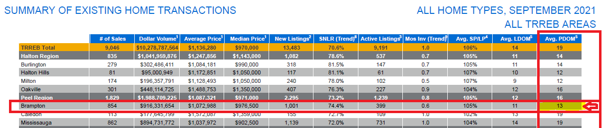 Another interesting fact to look at is the average Number of Days it took in September to sell a house in Brampton.